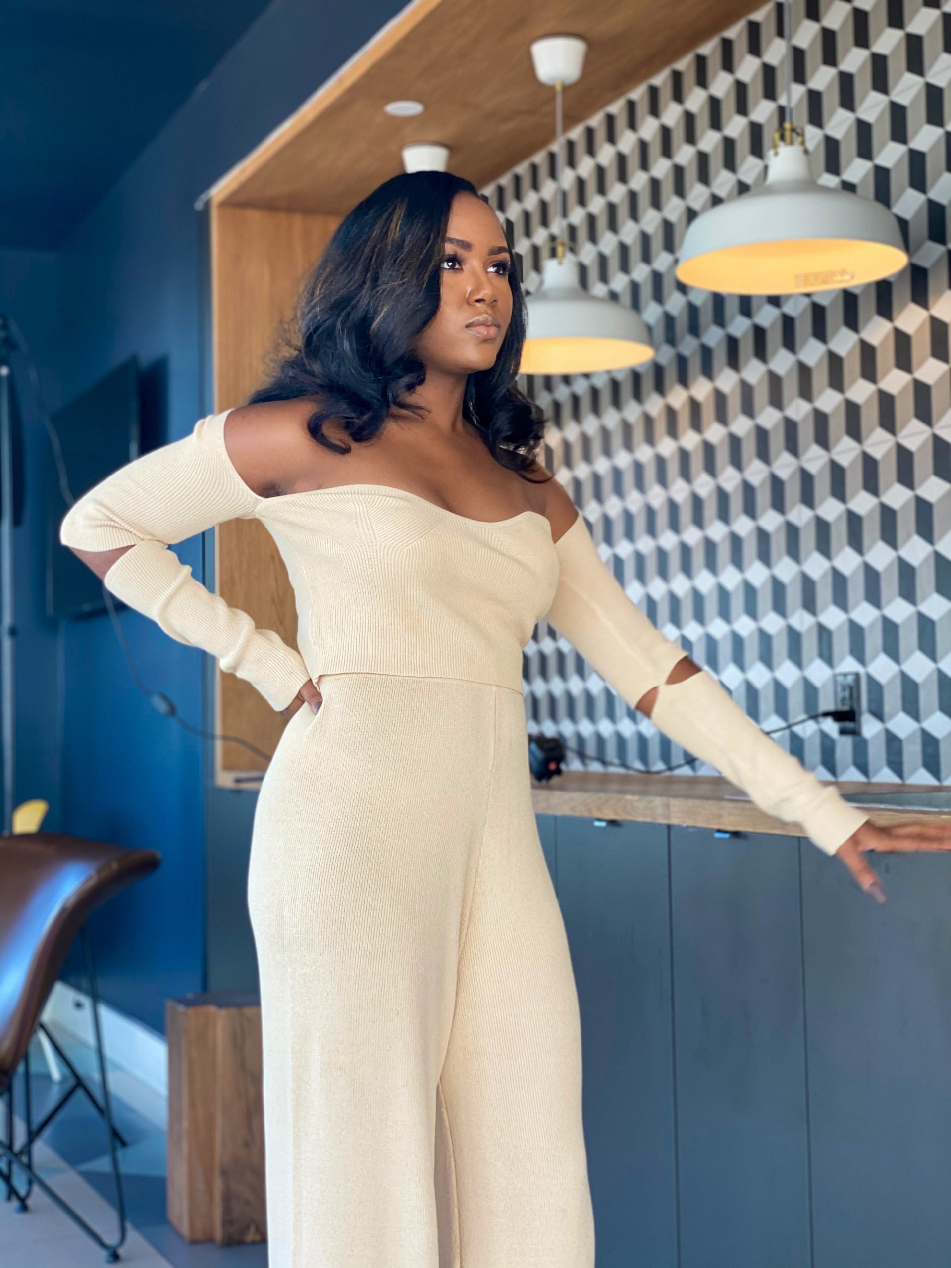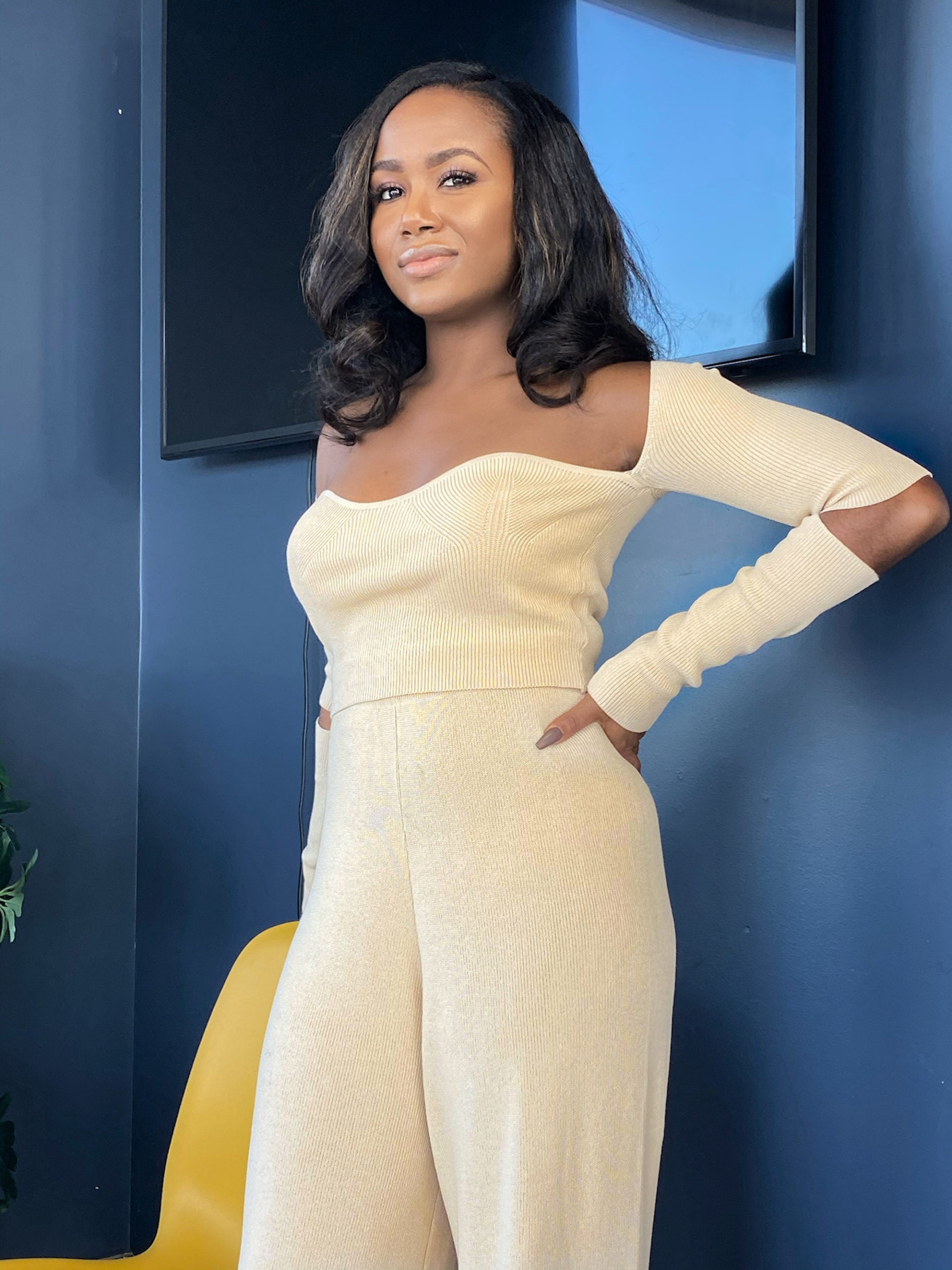 The Elegant knit wide-leg pants with crop top set, comes in Black and Tan