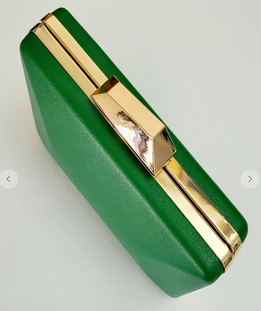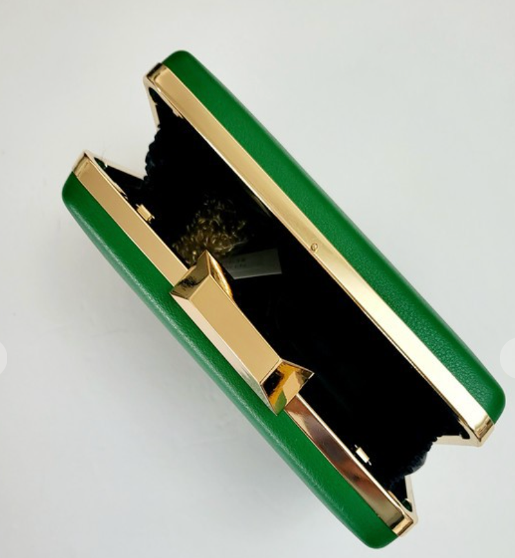 Gold Frame Clutch Handbag Kiss Lock Closure Vegan Leather Gold Metal Tone Detail Frame Long Detachable Chain Strap