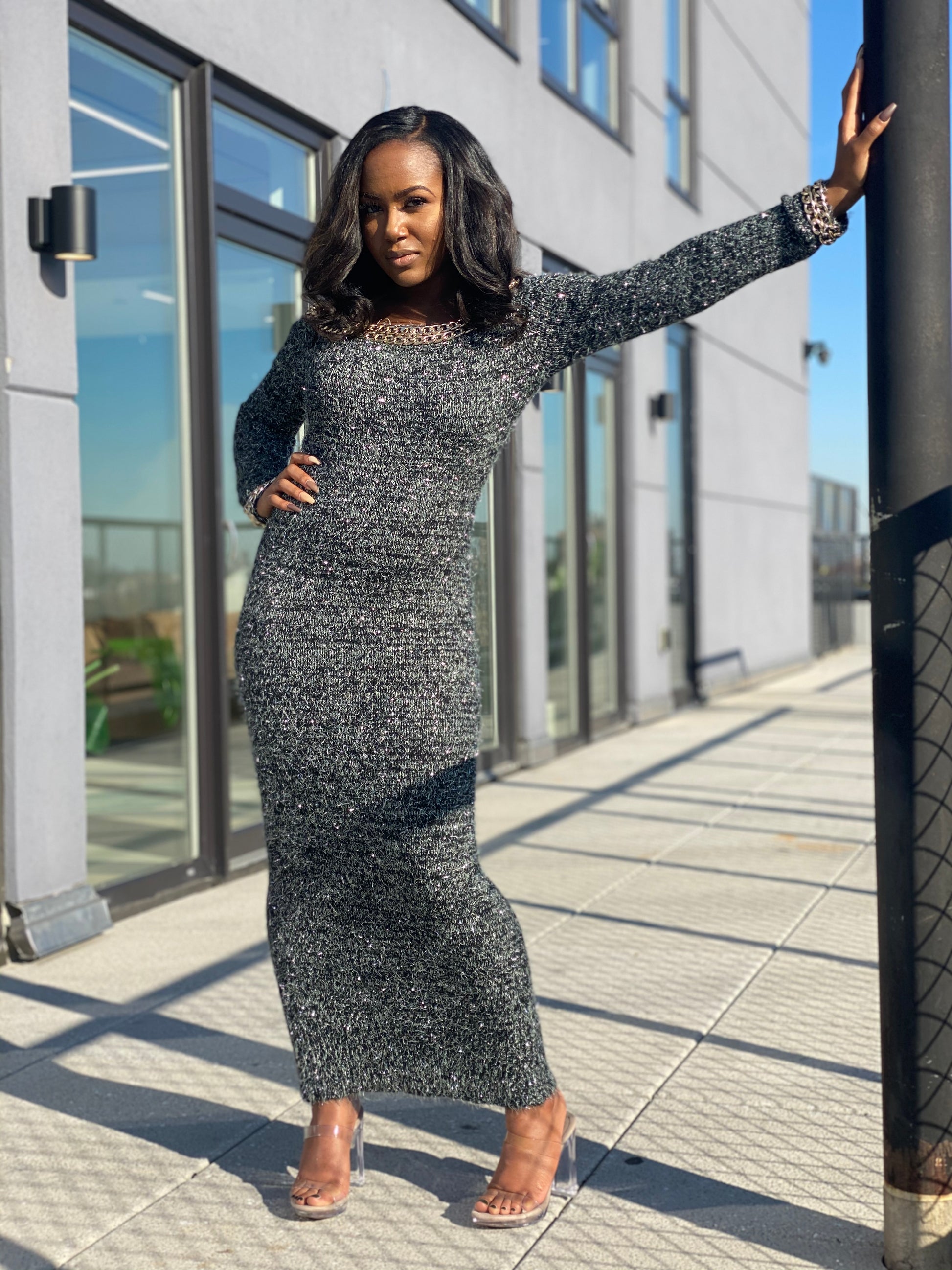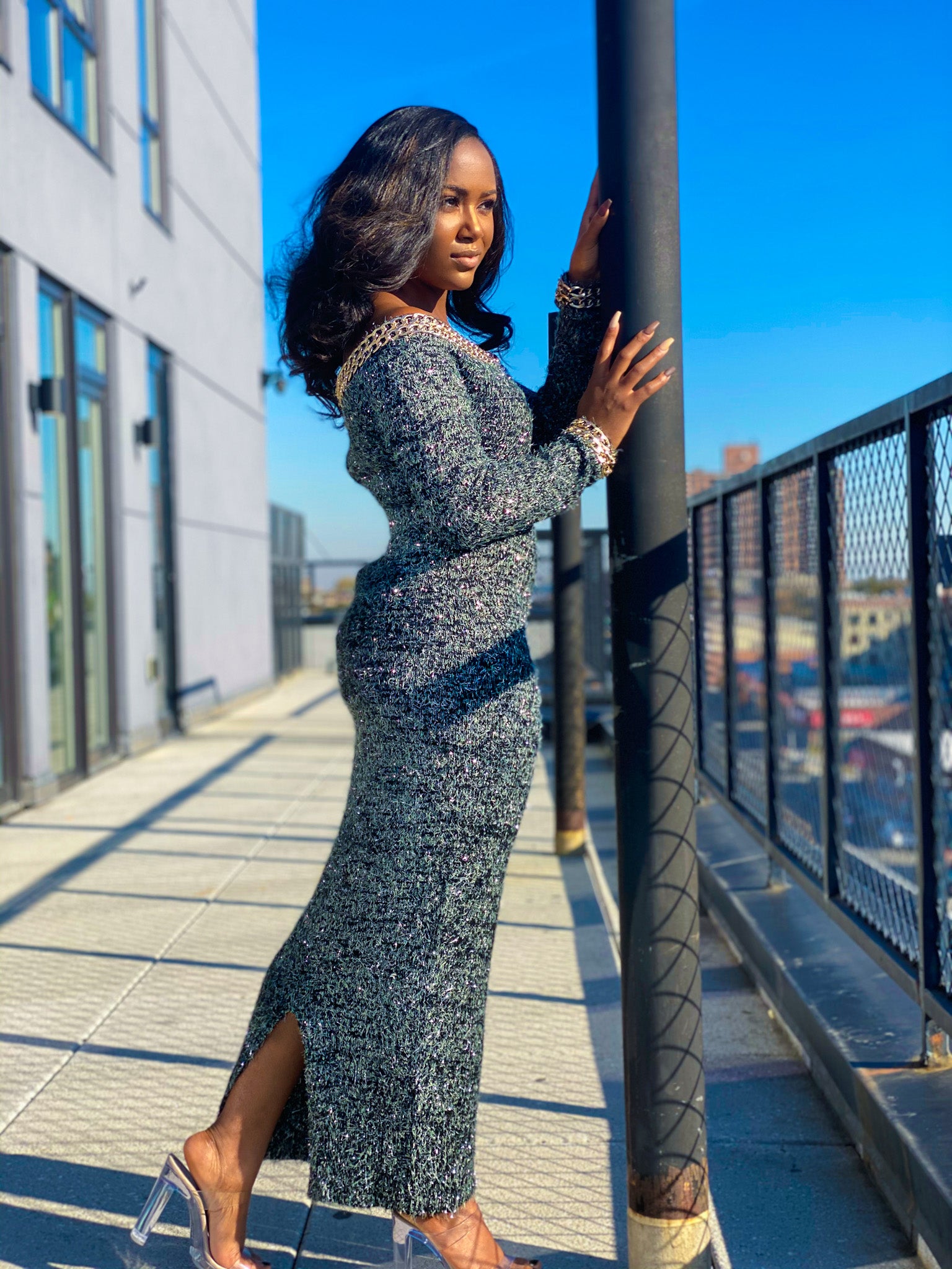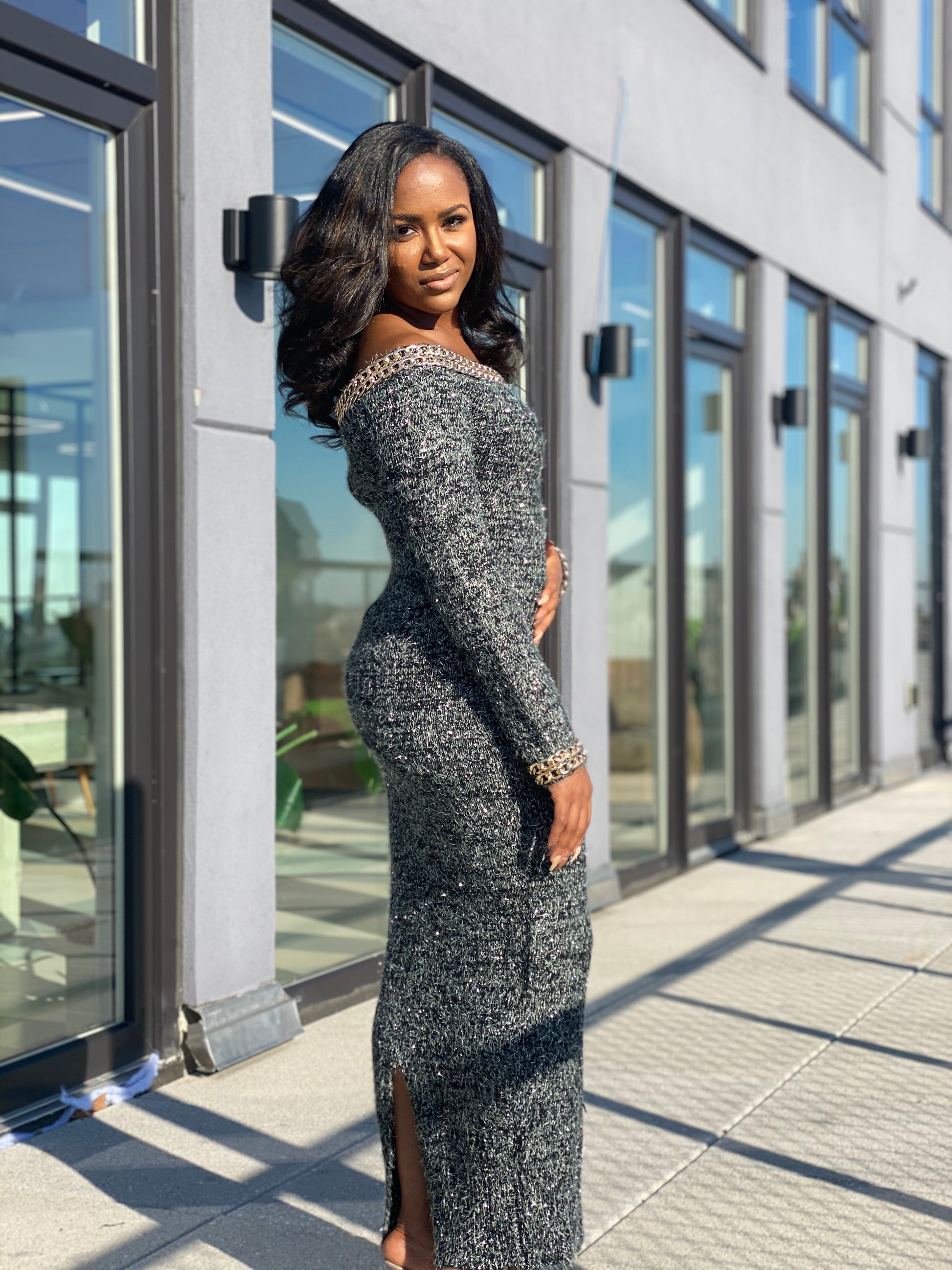 A dress fit for you, your majesty. A part of the Royal Urbane Collection, this off-the-Shoulder Confetti-like gold chain detailed Maxi Dress is one of a kind. Features a sweetheart gold chain detailed neckline , Fitted long sleeves frame the princess-seamed bodice, fitted waist, and alluring maxi skirt with a back slit. No Lining Invisible back zipper
